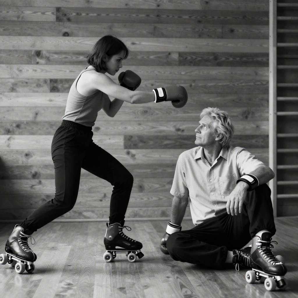 Black-and-white photograph of two people in a wooden-walled room. Young woman with short dark hair, sleeveless top, and black pants kneels, punching right fist forward. Older man with blond hair, light shirt, and dark pants sits on the floor, looking up at her. Both wear boxing gloves and roller skates. Woman's expression is focused. Man's expression is neutral. Wooden wall background.