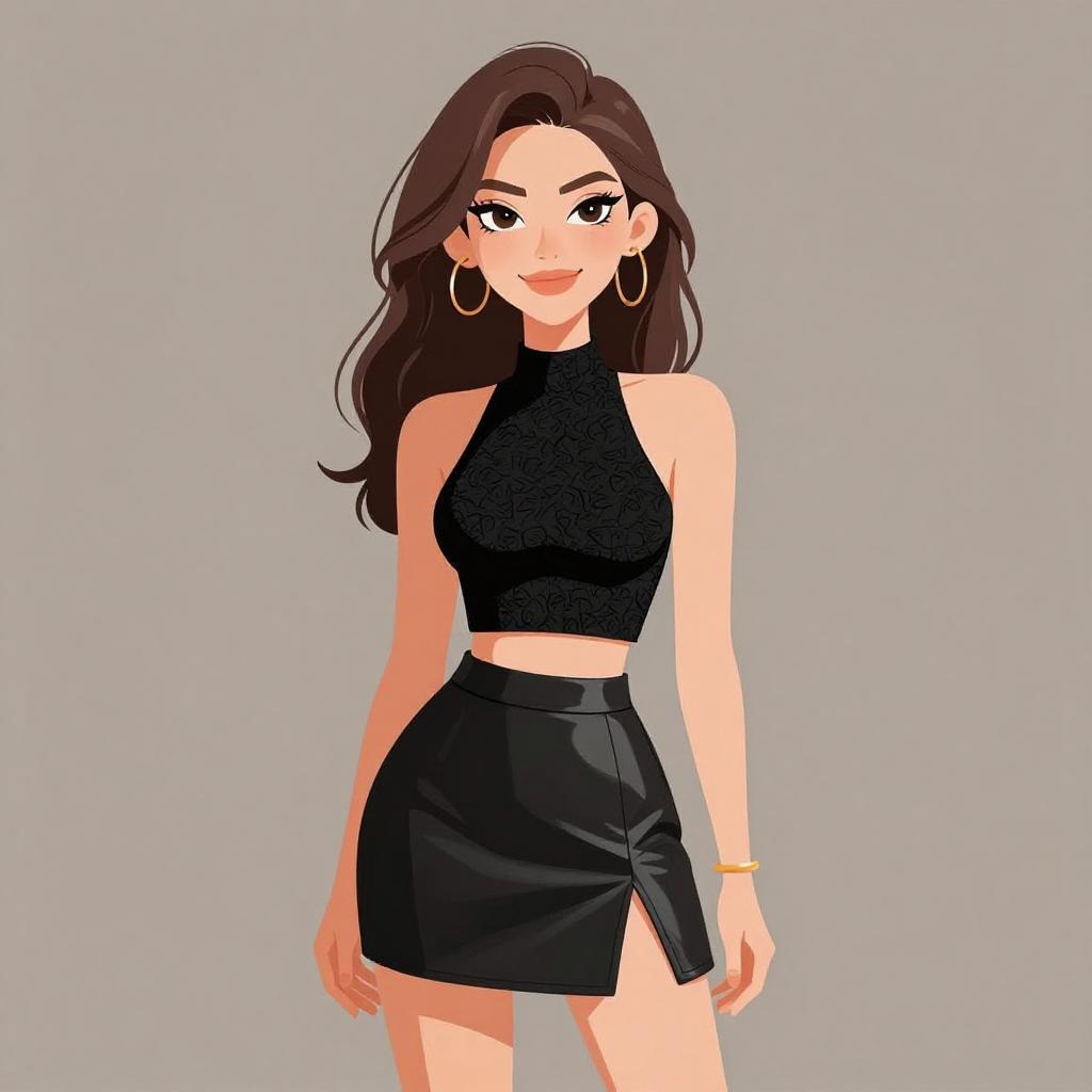 Woman with pretty face and pretty hair. smiling Woman, edgy, black textured halter crop top, high neck, sleeveless, paired with black faux leather skater skirt, high-waisted, flared hem, mid-thigh length, minimal gold bangle on wrist. --sref 1467