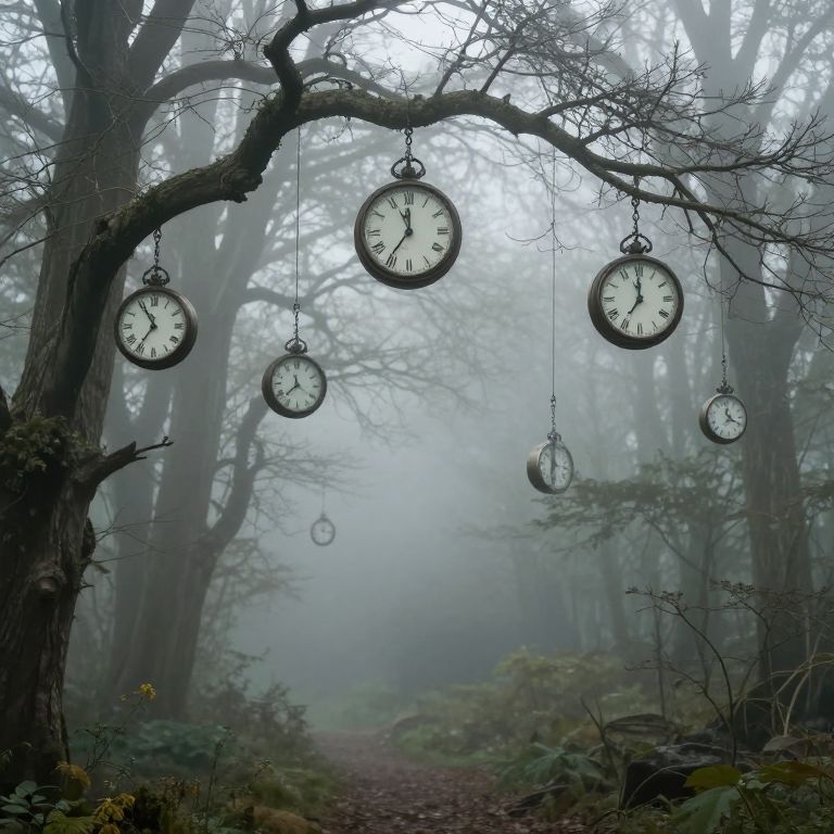 Surreal Clocks in Misty Forest