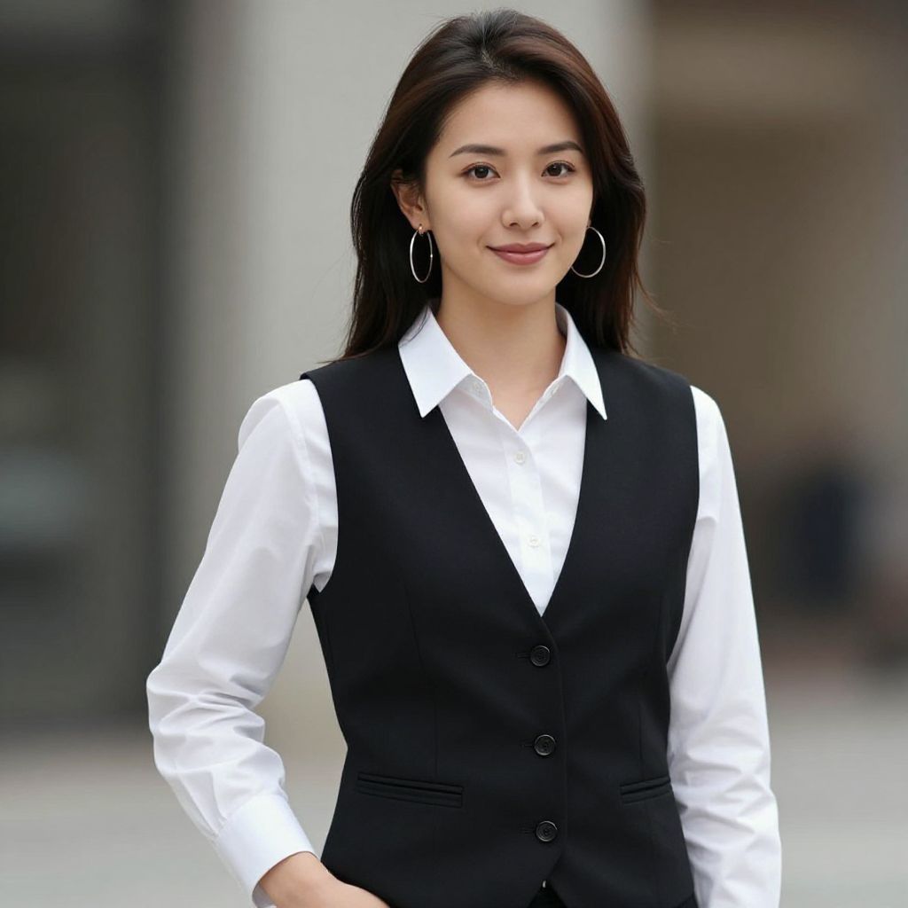 Photograph of an Asian female airline flight attendant in white shirt, black tie, and skirt, wearing a pilot's cap, standing in front of a