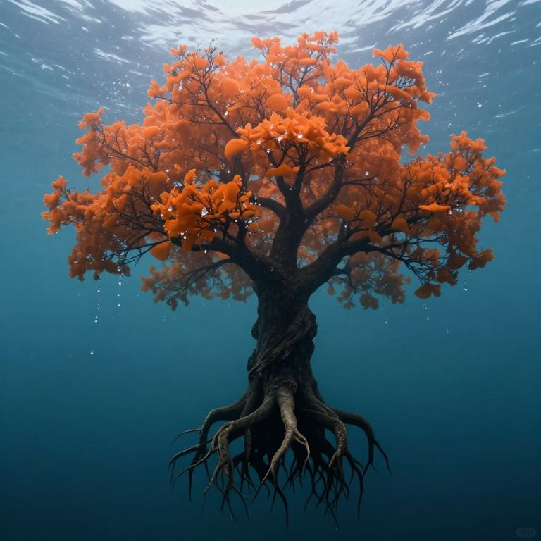 Photograph of an underwater scene featuring a surreal tree with vibrant orange flowers and a dark, gnarled trunk. The tree's roots are visible, extending downward into the deep blue water. Sunlight filters through the water's surface, illuminating the orange flowers and casting a glow around them. Tiny bubbles float around the tree, adding a sense of movement and life to the scene. The background is a gradient of dark to lighter blue, creating a contrast that highlights the tree's striking colors and unusual presence in an aquatic environment.