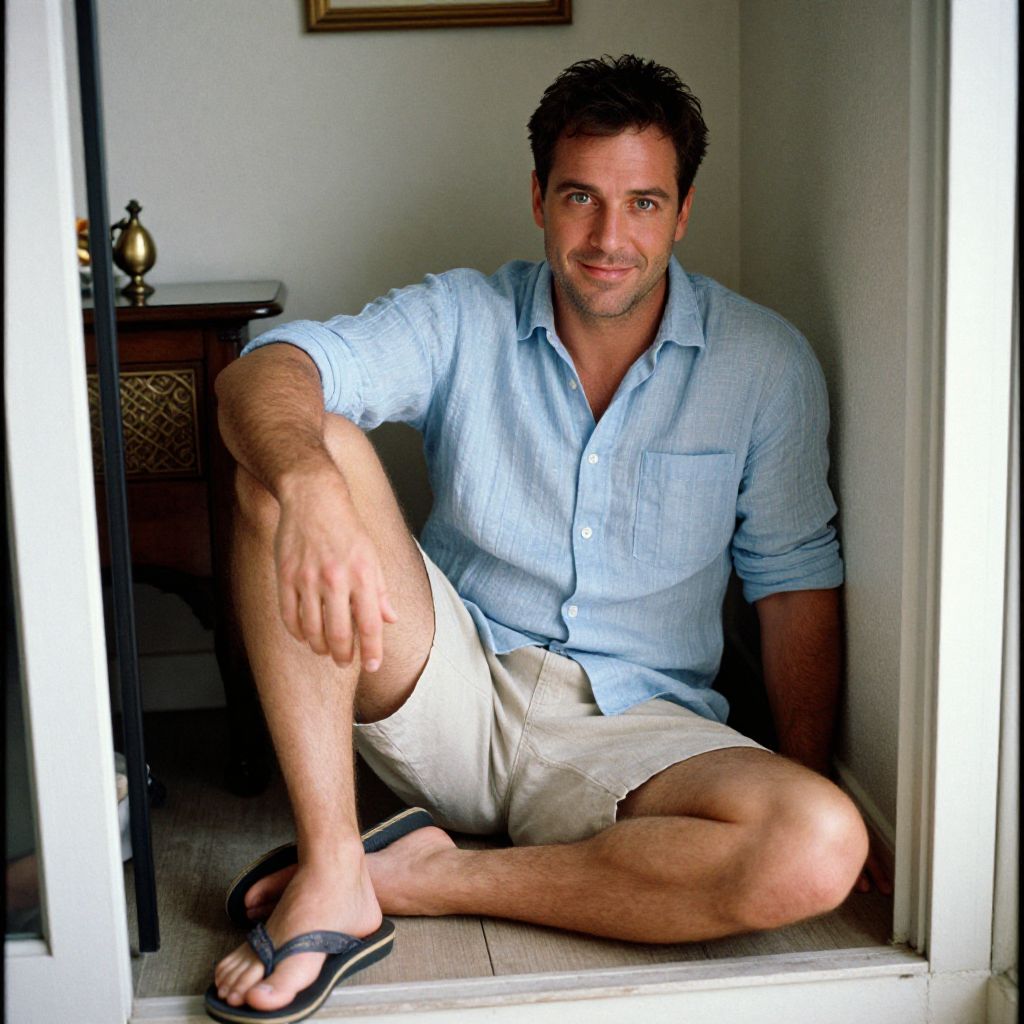 A man, lightweight linen shirt, pastel blue, beige cotton shorts, comfortable flip-flops, cozy nook, soft lighting, vintage decor, AgfaColor film, relaxed smile, casual vibe. Man has masculine face and piercing eyes