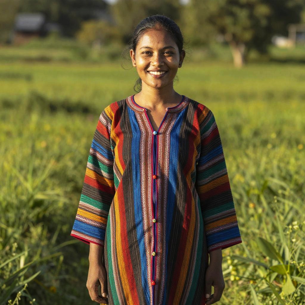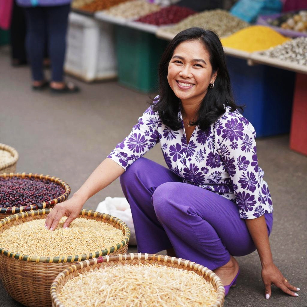 Photograph of a smiling Asian woman with black hair, wearing a white floral blouse and purple pants, squatting among large woven baskets filled with grains at