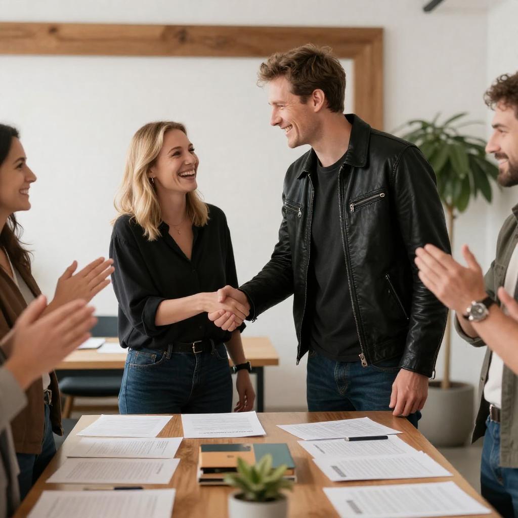 Photograph of three business professionals. Man in dark gray suit with red tie, arms crossed, center. Blonde woman in black suit, smiling, hand on man's shoulder, right. Woman with curly brown hair, red blazer, white blouse, smiling, right. Bright office background.