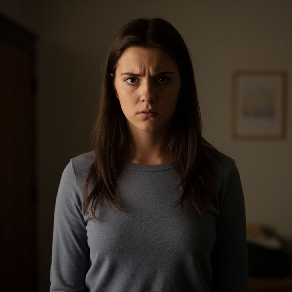 A young woman with intense determination on her face, standing in a dimly lit room with a focused expression, captured in a realistic photography style