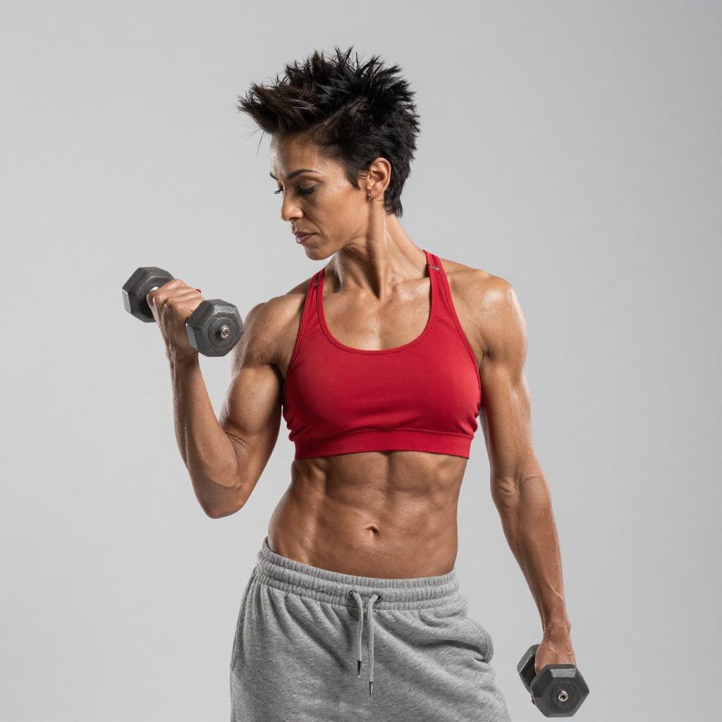 Photograph of a muscular, dark-skinned woman with short, spiky black hair. She wears a red sports bra and gray sweatpants, holding a small dumbbell in each hand. Her right arm is raised, showcasing her defined biceps and abs. The background is a gradient of white to gray.