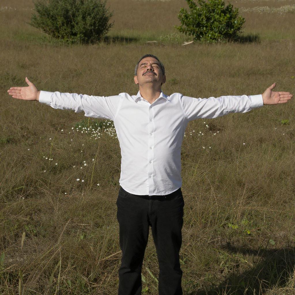 Middle-aged man with white shirt, black pants, outstretched arms, standing in grassy field, looking up with closed eyes. Sparse vegetation, small white flowers, and green shrubs in background. Sunlight illuminates scene, creating slight shadows. Man's mustache visible. Natural, outdoor setting.