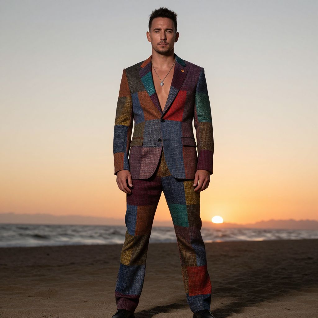 A stylish man stands confidently on a beach at sunset, wearing a bold, multicolored patchwork suit that exudes a contemporary fashion statement.