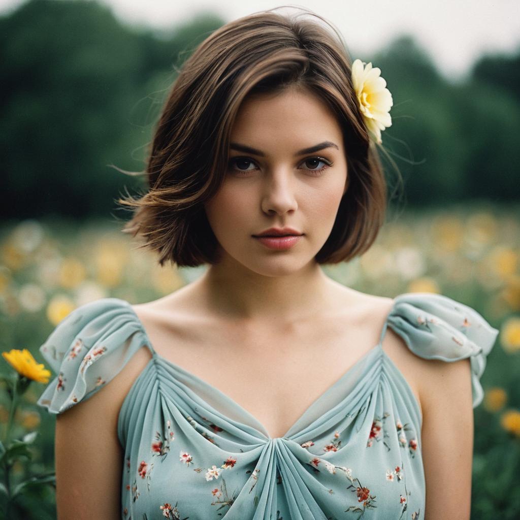 Garden party attire female,1girl, dress, flower, green dress, brown hair, hair ornament, realistic, solo focus, looking at viewer, brown eyes, breasts, outdoors, blurry, long sleeves, plant, hair flower, blurry background, floral print, collarbone