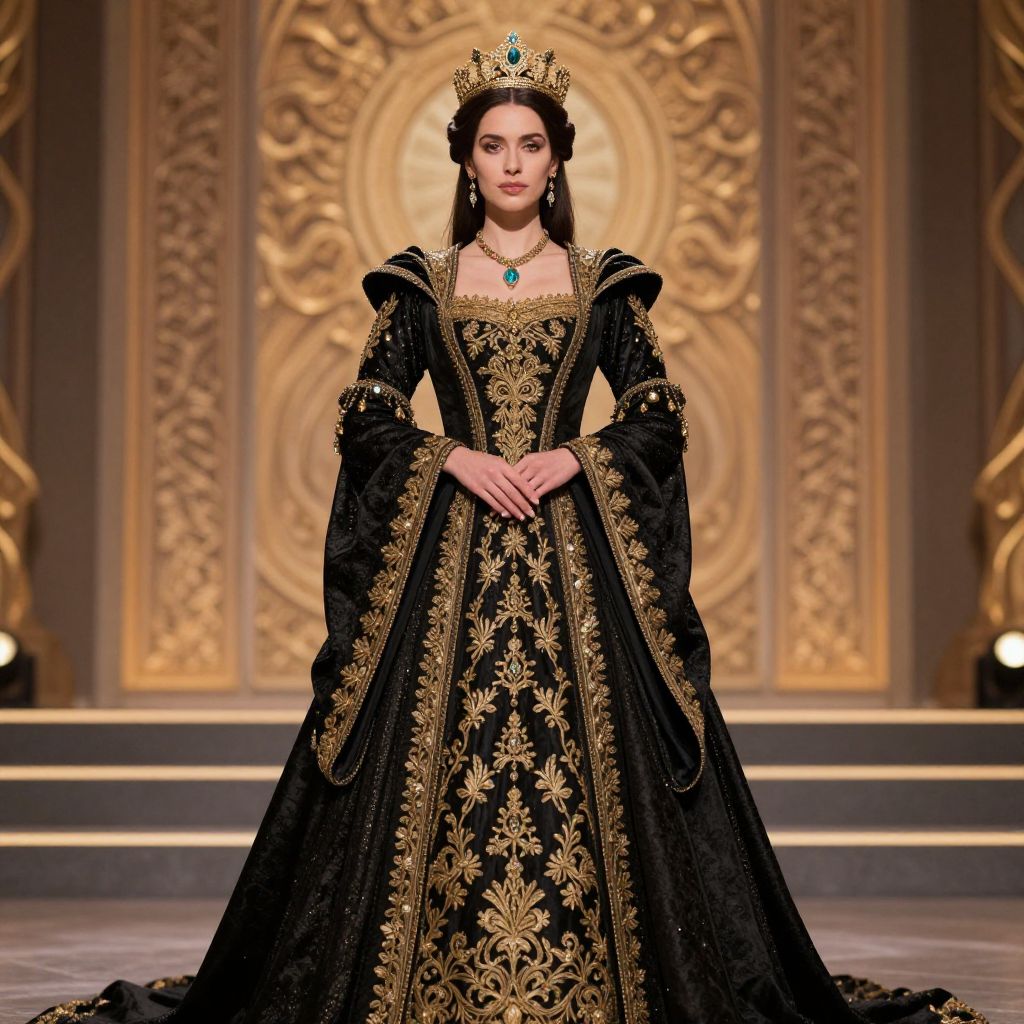 A regal woman adorned in an elaborate black gown with intricate golden embroidery stands confidently against a beautifully illuminated backdrop. Her majestic attire and elegant styling reflect a historic or fantasy theme, evoking a sense of nobility and grace.