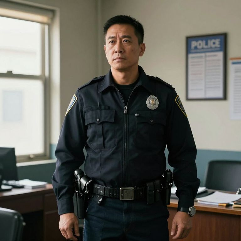 Photograph of an Asian male police officer standing in a well-lit, modern office. He has short black hair, a medium build, and a serious expression. He wears a dark navy blue police uniform with a badge on his left chest, a utility belt with various equipment, and black pants. The background includes a window on the left, a desk with a computer and papers, and a "POLICE" sign on the right wall. The office has a neutral color palette with light gray walls and wooden furniture.