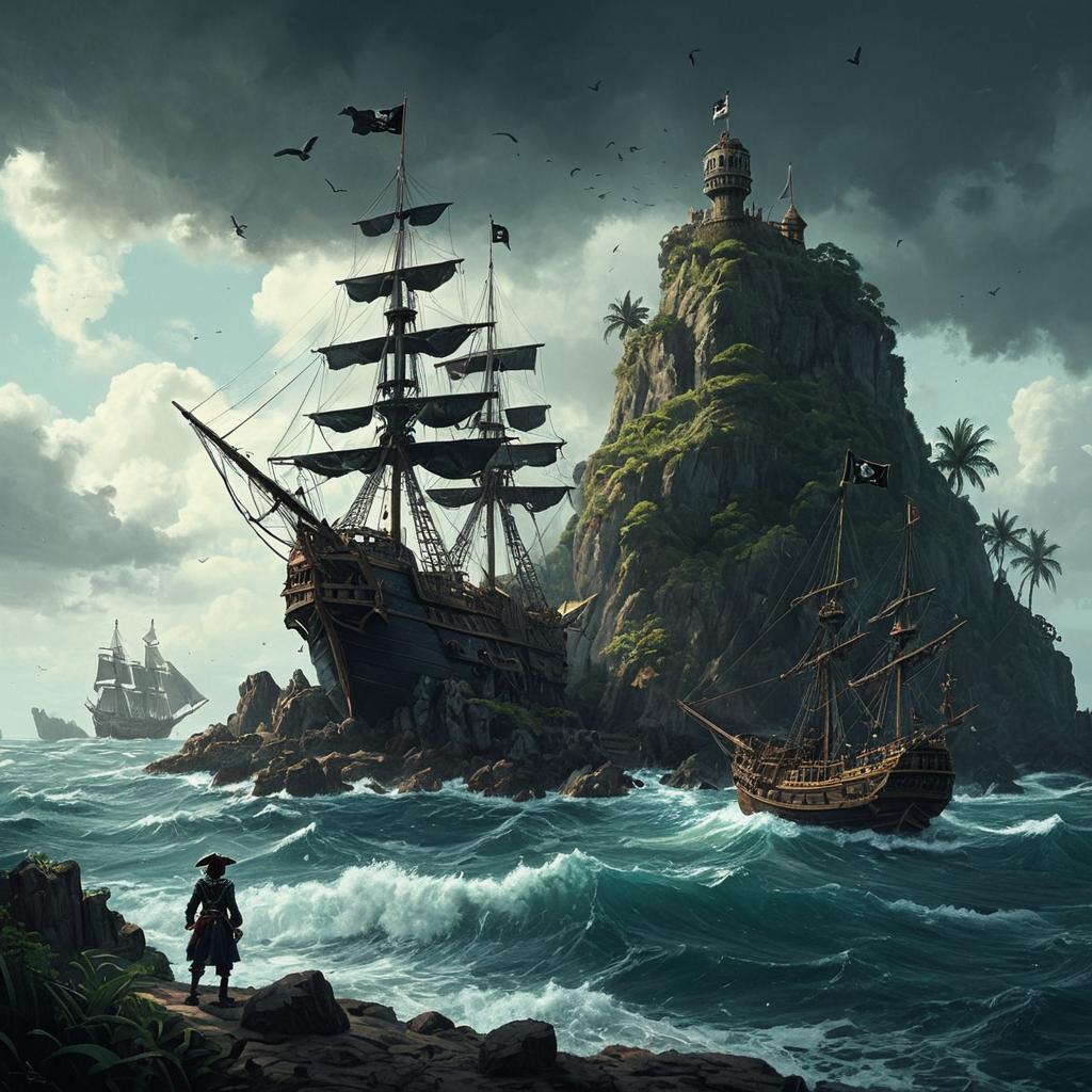 Pirate Ships Near Rocky Island with Fortress