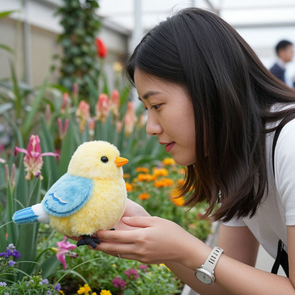 Woman Touching Plushie Bird at Flower Show