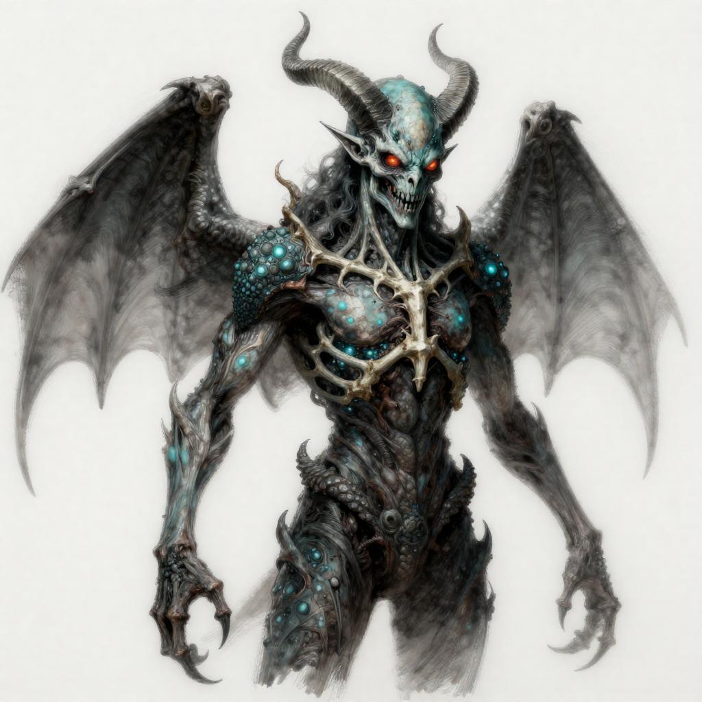 Draw a Void Harbinger with sickly teal skin veined with bone-white ridges and bioluminescent pustules with an original appearance, but with distorted and sinister details. Its features should evoke the darkness and chaos of the Abyss: flaming eyes, twisted claws, dark skin with scales, and perhaps even membranous wings or curved horns. The image should be in Digital Art style with a quality similar to silverpoint and ink wash, characterized by strong contrasts between light and shadow. The textures should give an impression of depth and richness, akin to those of a traditional painting.