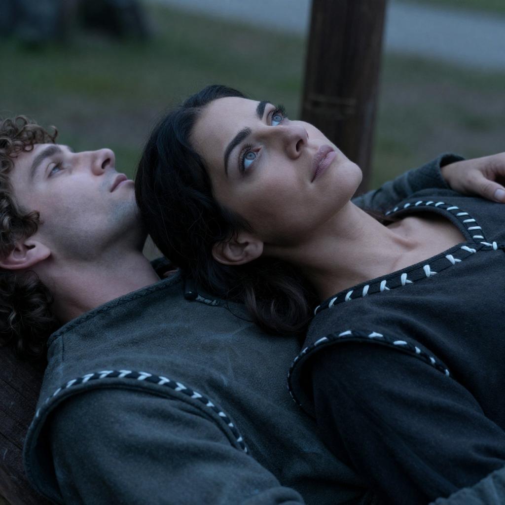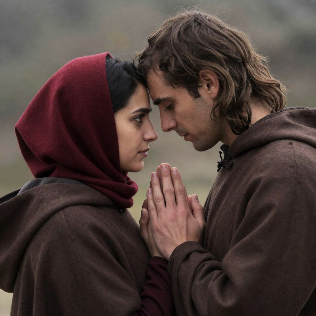 Photograph of two people in a close, intense interaction. Woman with dark hair, red headscarf, brown cloak, hands pressed together. Man with long brown hair, brown cloak, leaning in, eyes closed, forehead touching hers. Background: blurred outdoor setting. Both looking deeply into each other's eyes.
