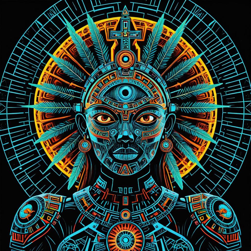 Artistic rendering of a tribal ceremonial mask featuring intricate geometric patterns and earth tone colors. The mask is adorned with long feathers and circular decorations, set against a dark tropical rainforest background with foliage details. The style blends tribal pattern abstraction with a vintage, weathered appearance.