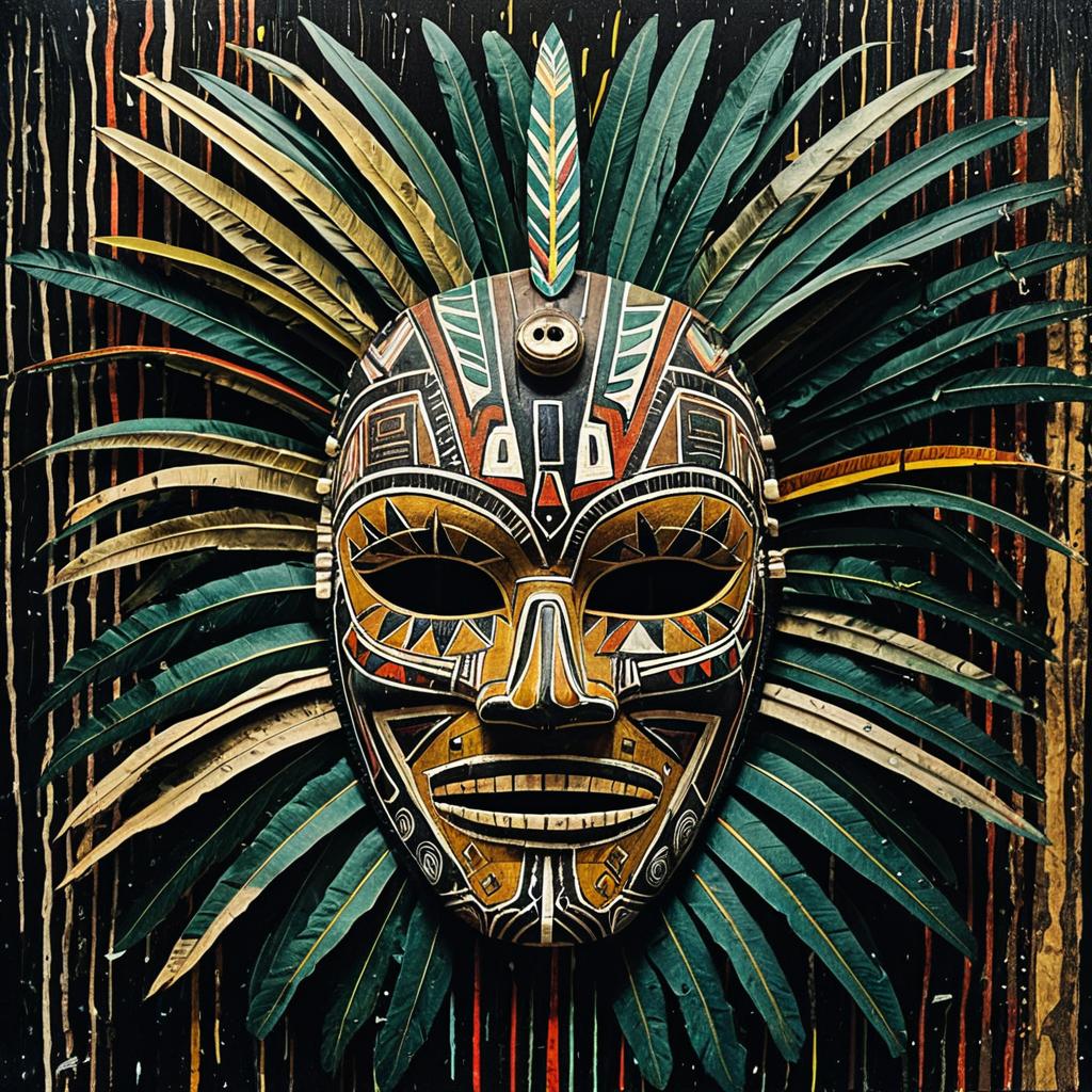Pen the ceremonial mask, in the style of tribal pattern abstraction, tropical rain forest, historical documentation, melding organic material and earth tones, mimicking ruined materials, Jean-Michel Basquiat, use of vintage imagery.