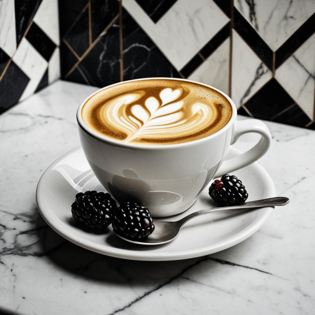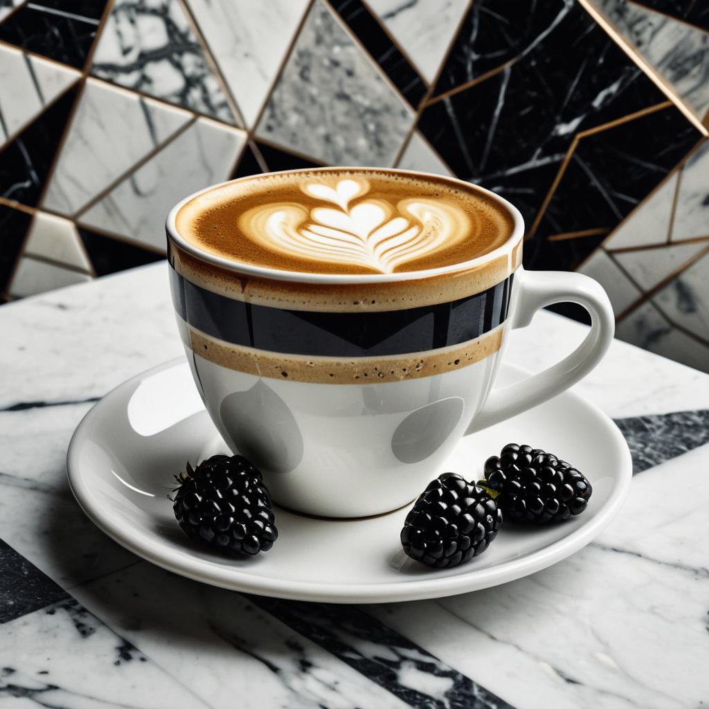 Latte coffee cup with blackberry, in the style of cubism, intricately textured, nostalgic atmosphere, UHD image, marble background
