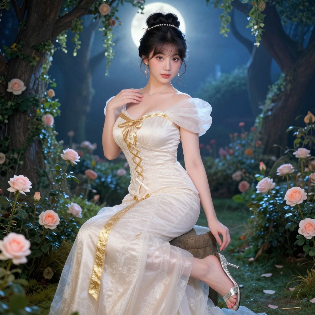 A high-resolution image of a woman in a detailed Cinderella costume, wearing a soft off-white mermaid-style dress, golden brocade ribbon, and a small glass slipper on her foot, posed in a magical garden with blooming roses and moonlight streaming through trees, her face lit gently by the ambient glow. The woman has big tits and cute face
