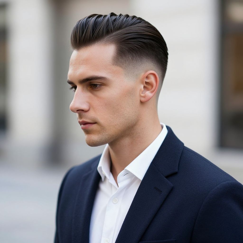 Mullet Fade, fit European man, realistic photo of a well-groomed man with a mullet fade haircut, stylish and modern, wearing a tailored jacket, city street background, natural lighting, high detail, cinematic look