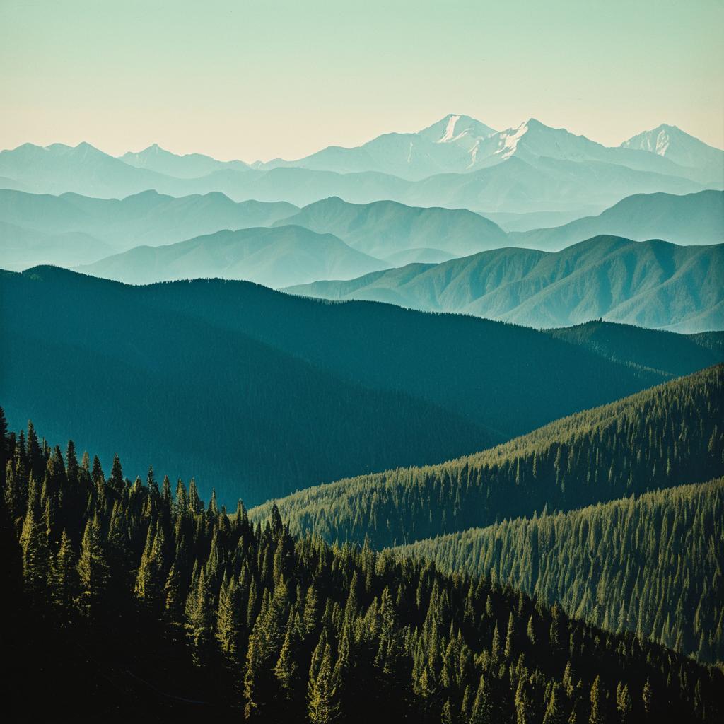 Minimalist landscape view featuring multiple layers of dark green forested mountain ridges leading to a majestic snow-capped peak in the distance. The image uses a muted color palette of blues and greens, emphasizing soft silhouettes and atmospheric depth.