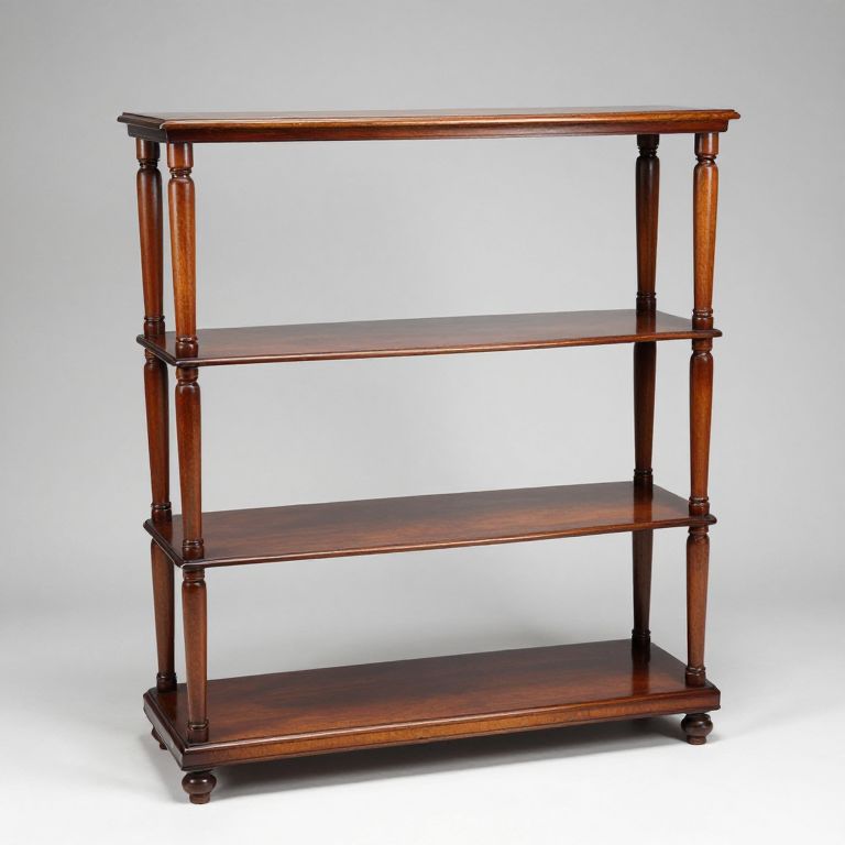 Photograph of a classic, three-tier wooden shelf unit with a polished, dark brown finish. The shelf unit features four slender, turned legs supporting each tier, and a flat, rectangular top. The three shelves are evenly spaced, with the bottom shelf being the widest. The wood has a glossy, reflective surface, highlighting its smooth texture. The background is a simple, light gray gradient, emphasizing the shelf's detailed craftsmanship and elegant design. The image is well-lit, showcasing the rich, warm tones of the wood.