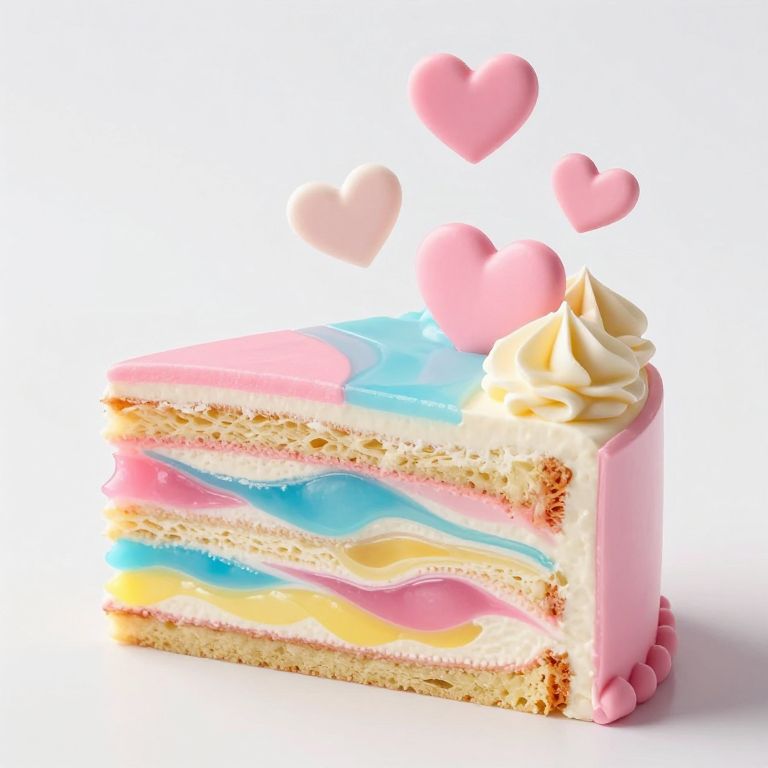 A whimsical slice of cake defies convention with its vibrant, marbled layers of pink, blue, and yellow, crowned by delicate heart-shaped decorations that seem to float magically above the creamy frosting.