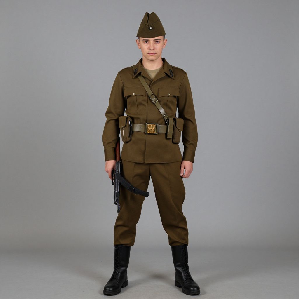 905327183334a3a853593f878f9f42a6 costume, hat, 1boy, solo, male focus, weapon, military uniform, uniform, boots, military, gun, belt, standing, jacket, long sleeves, military hat, looking at viewer, full body, arms at sides, black footwear, closed mouth, pants, holding weapon, indoors, sheath, brown jacket, knife, holding, brown pants, buckle, brown headwear, sheathed, holding gun, peaked cap, dagger, belt buckle, holster, shirt, military jacket