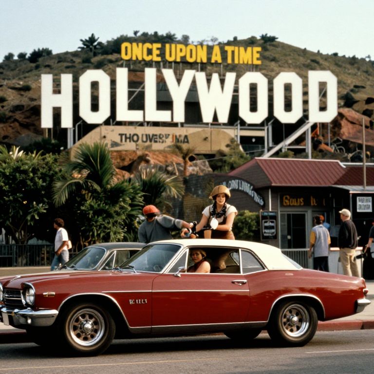 Scene from the movie 'Once Upon a Time in Hollywood' featuring a vintage red convertible car parked on the street in front of the iconic Hollywood sign. The background includes hillside vegetation and a small building. Several people are around the car, with one woman sitting inside and another person standing through the sunroof. The setting evokes 1960s Hollywood.