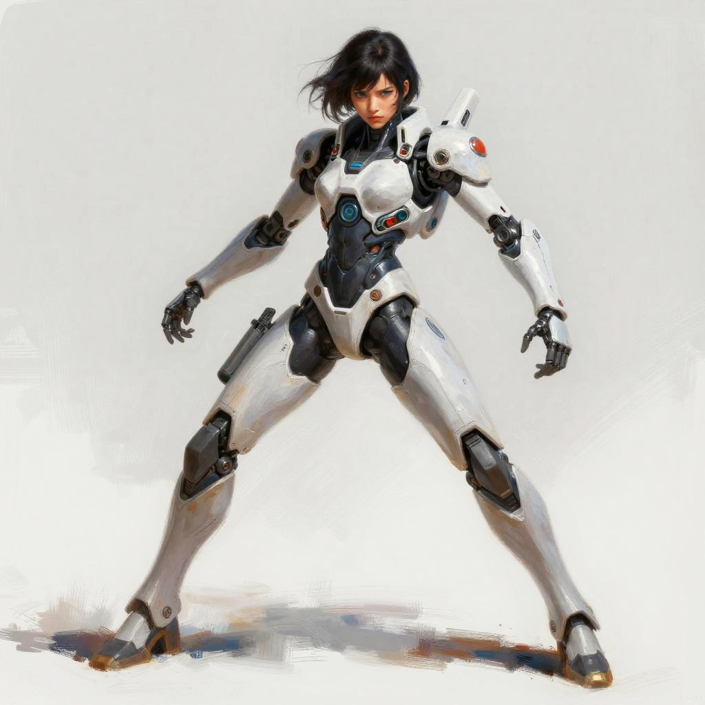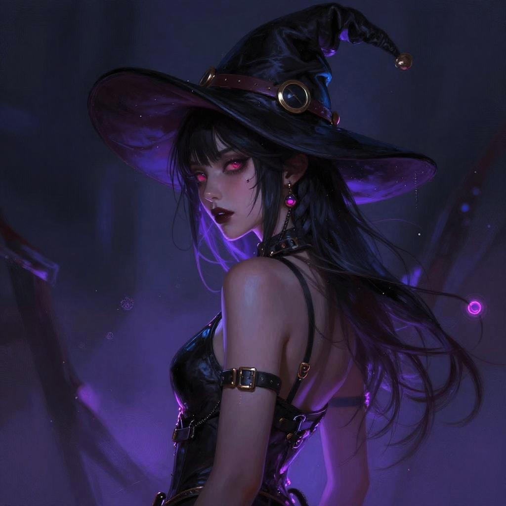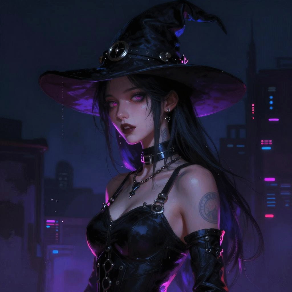 Pretty cyber witch, half body, neon lights, digital painting by Melowh_art, impressionist style, mysterious aura.