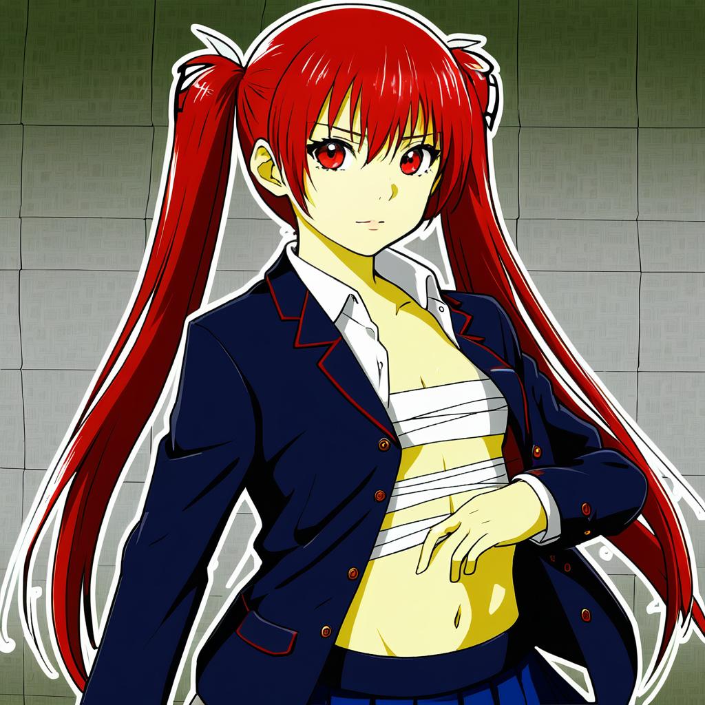 Digital anime-style drawing of a young woman with long, vibrant red hair in twin ponytails. She has striking red eyes and a confident expression. She wears a dark navy school uniform blazer with red piping, open to reveal white bandages wrapped around her chest and midriff, exposing her cleavage. Her left hand rests on her stomach. The background is a gradient of gray to black with a tiled pattern. The character has fair skin and a slender build. The drawing uses bold lines and vibrant colors, with a slight glow effect around the character.
