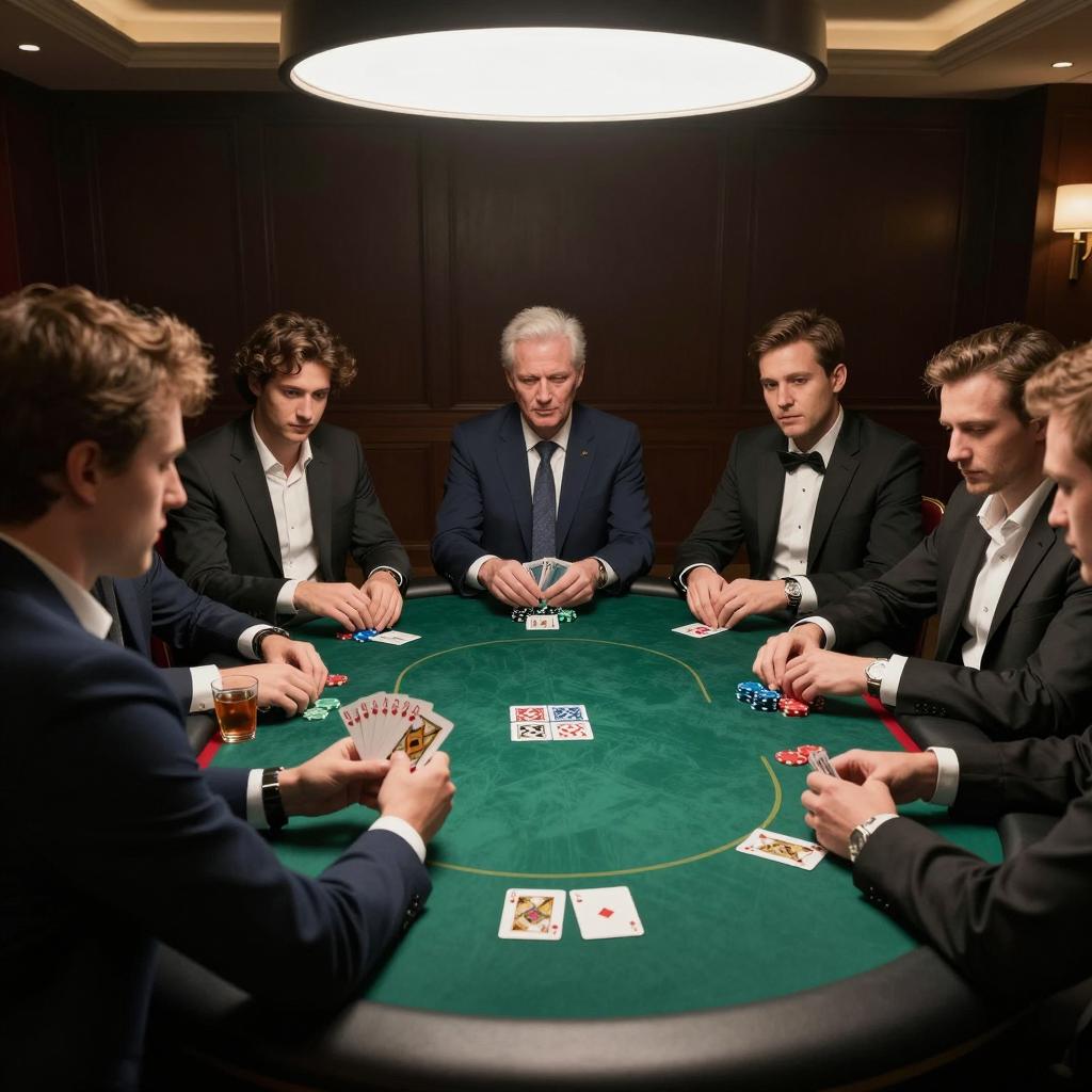 A poker game. Seven men, dressed in suits, sit around a circular table. One man in the foreground, holding a hand of cards, shuffles them. Other men observe, some with intense expressions. Drinks and poker chips on the table. Overhead lighting creates a circular glow.