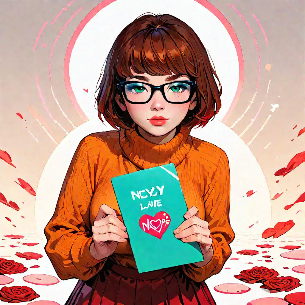 Score_9, Velma Dinkley is holding a valentine's card, human, pov