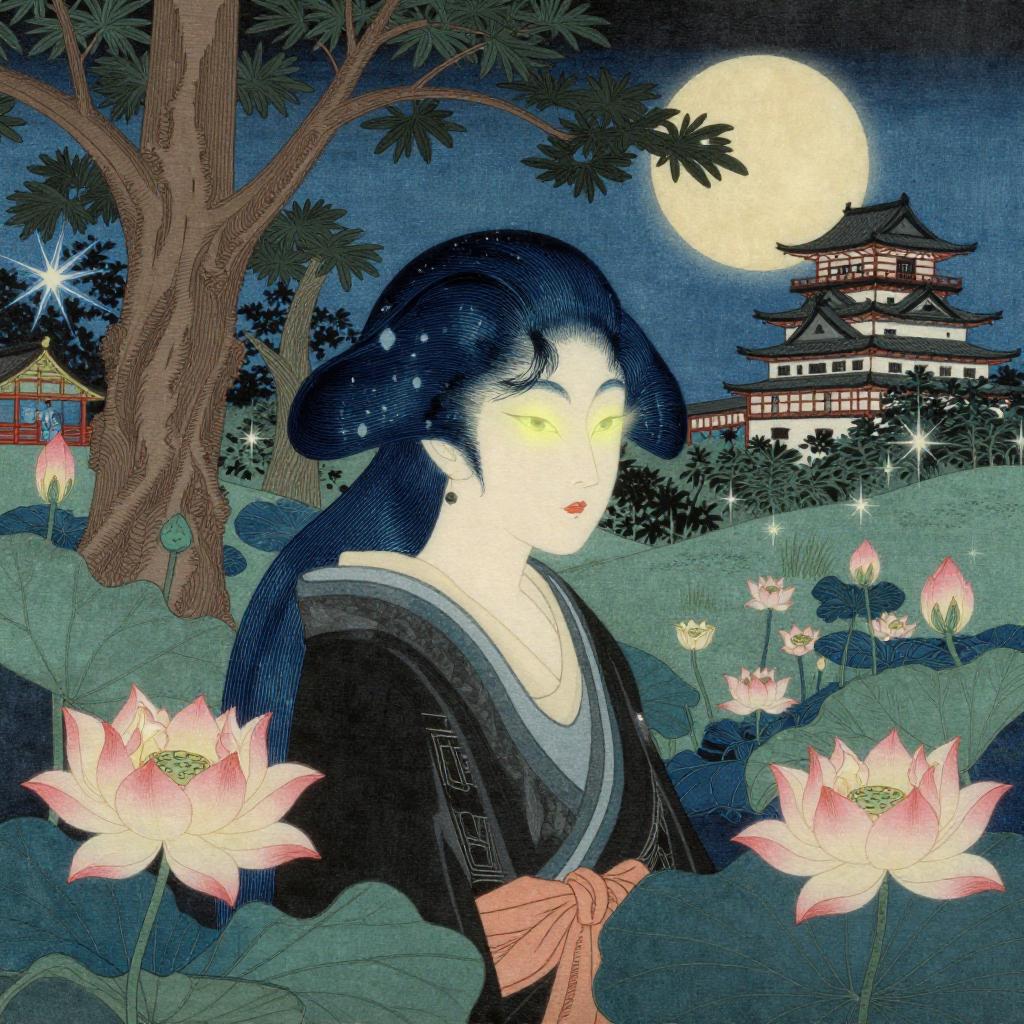 A detailed woodblock print inspired Ukiyo-e style illustration of an enigmatic girl with blue hair and magical glowing eyes. She is surrounded by a fantastical nighttime landscape featuring blooming lotus flowers, ancient trees, a full moon, and a distant traditional Japanese castle. The background also includes a falling star over an enchanted garden, adding a mystical ambiance to the scene.