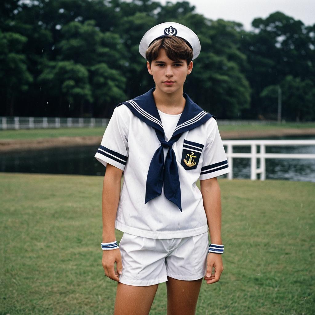 Sailor suit costume,1boy, male focus, solo, sailor, shirt, white shirt, sailor collar, realistic, shorts, white shorts, brown hair, outdoors, looking at viewer, closed mouth, short hair, cowboy shot, school uniform, standing, see-through, wristband, wet