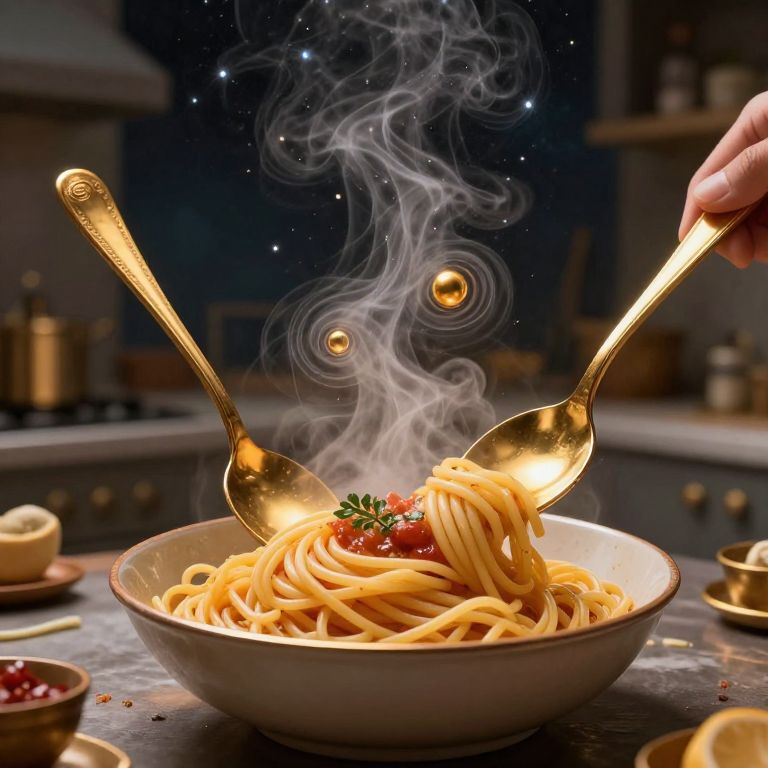 In a surreal cosmic kitchen, giant golden spoons stir a simmering bowl of spaghetti, their rhythmic motion conjuring spirals of steam that dance like celestial bodies under a starlit sky, evoking a sense of wonder and infinite possibility.