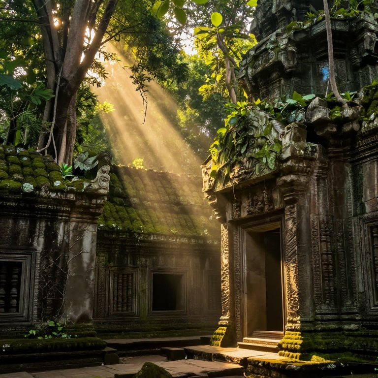 Ancient ruins engulfed by dense jungle, beams of golden sunlight piercing through thick canopy, weathered stone pillars covered in moss and vines, mystical atmosphere, detailed textures showing age and history, vibrant green and earth tones