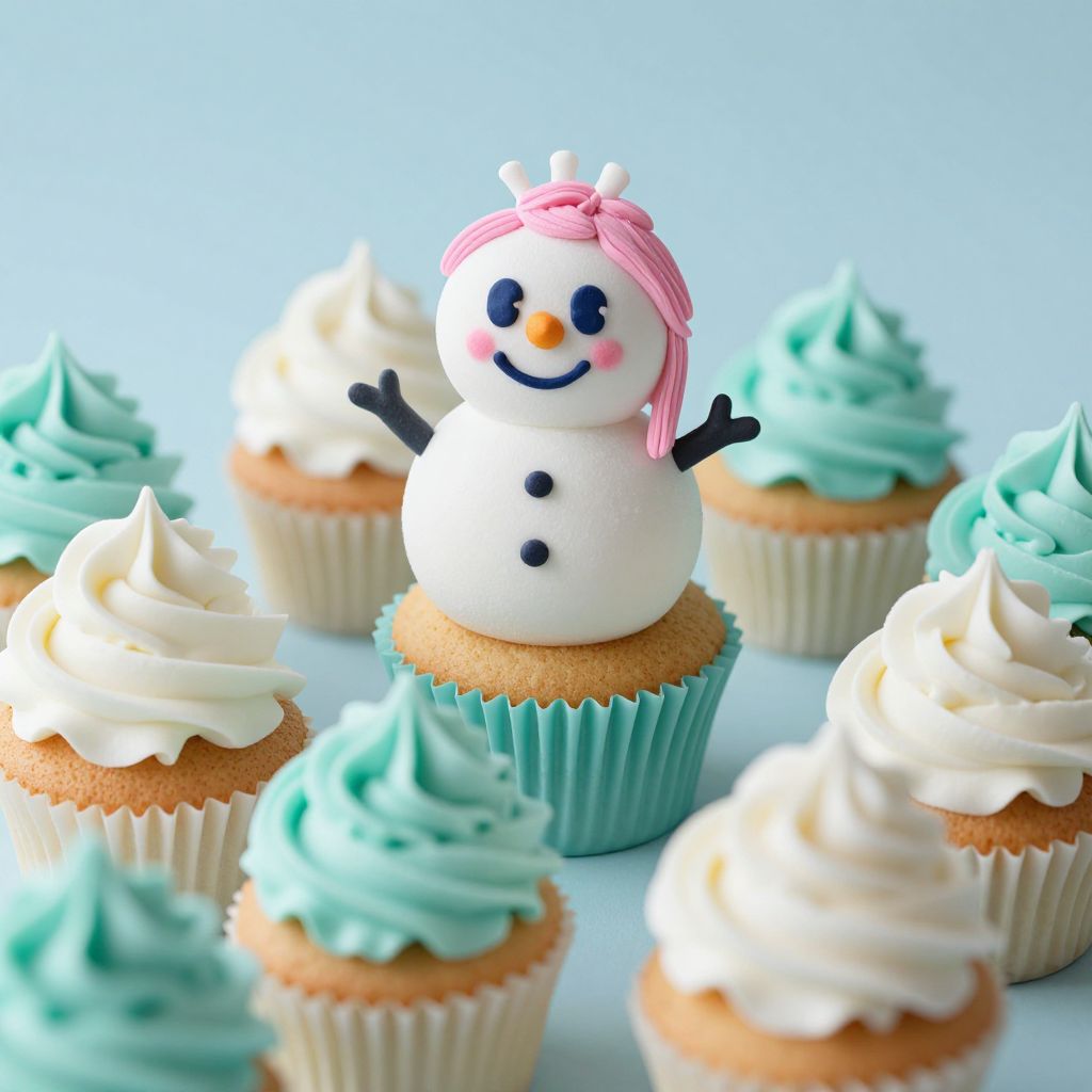A whimsical assembly of cupcakes adorned with ethereal swirls of white and teal icing, crowned by a playful snowman cupcake with rosy cheeks and a sprig of pink hair, defying the mundane with its charmingly surreal charm.