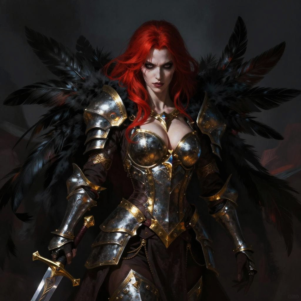 This digital artwork features a stern-looking, fair-skinned woman with long, flowing white hair. She's clad in dark, ornate armor adorned with gold accents and a prominent winged emblem on her chest. Her armor includes a skull with glowing red eyes on her right shoulder. The background is a swirling mix of dark red and black hues, adding a dramatic effect. Her blue eyes stand out against the dark tones. The style is highly detailed and realistic.
