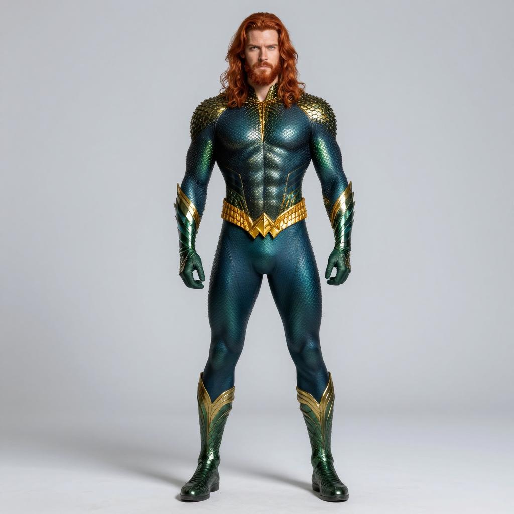 Aquaman spandex costume, photorealistic, long red-haired male superhero with beard, blue and black tight-fitting costume with gold accents, yellow belt with gold buckle, standing confidently, neutral light gray background, studio lighting, strong muscular build, serious expression, full body, front view, comic book style, high detail, digital art, modern superhero, realistic ures