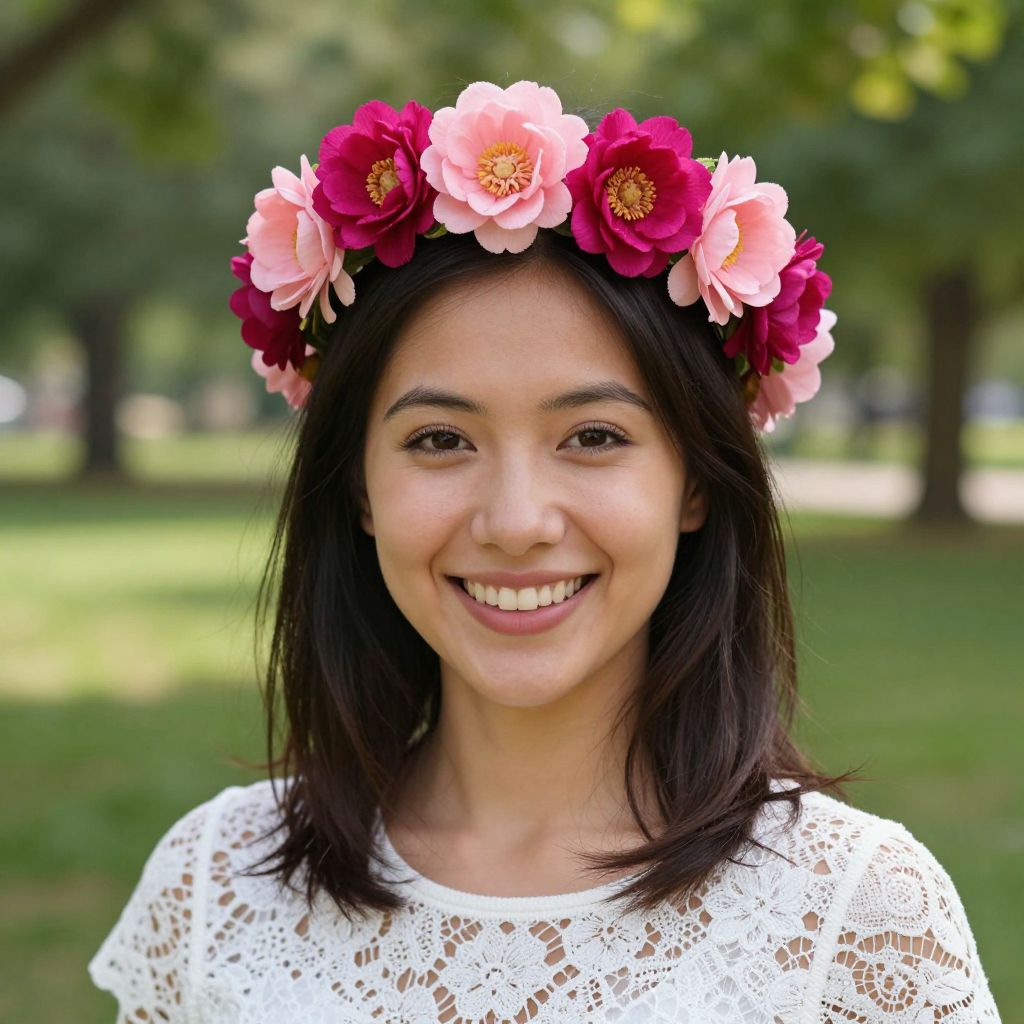 Smiling woman wearing a vibrant summer flower crown featuring six blossoms in shades of pink and magenta, complemented by a delicate white lace top, set against a lush green park backdrop with trees and sunlight filtering through.