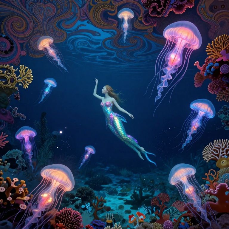 Craft an image reminiscent of surrealism, depicting an underwater realm where a mesmerizing mermaid adorned with lustrous scales intertwines with an enigmatic landscape composed of distorted timepieces and whimsical geometric forms adrift in the depths. The ethereal mermaid gracefully perches upon a fragile glass stage suspended between the water's surface and a celestial expanse brimming with enchanting, levitating entities, inviting viewers to embark on a captivating journey through the marriage of fantasy and surrealism.