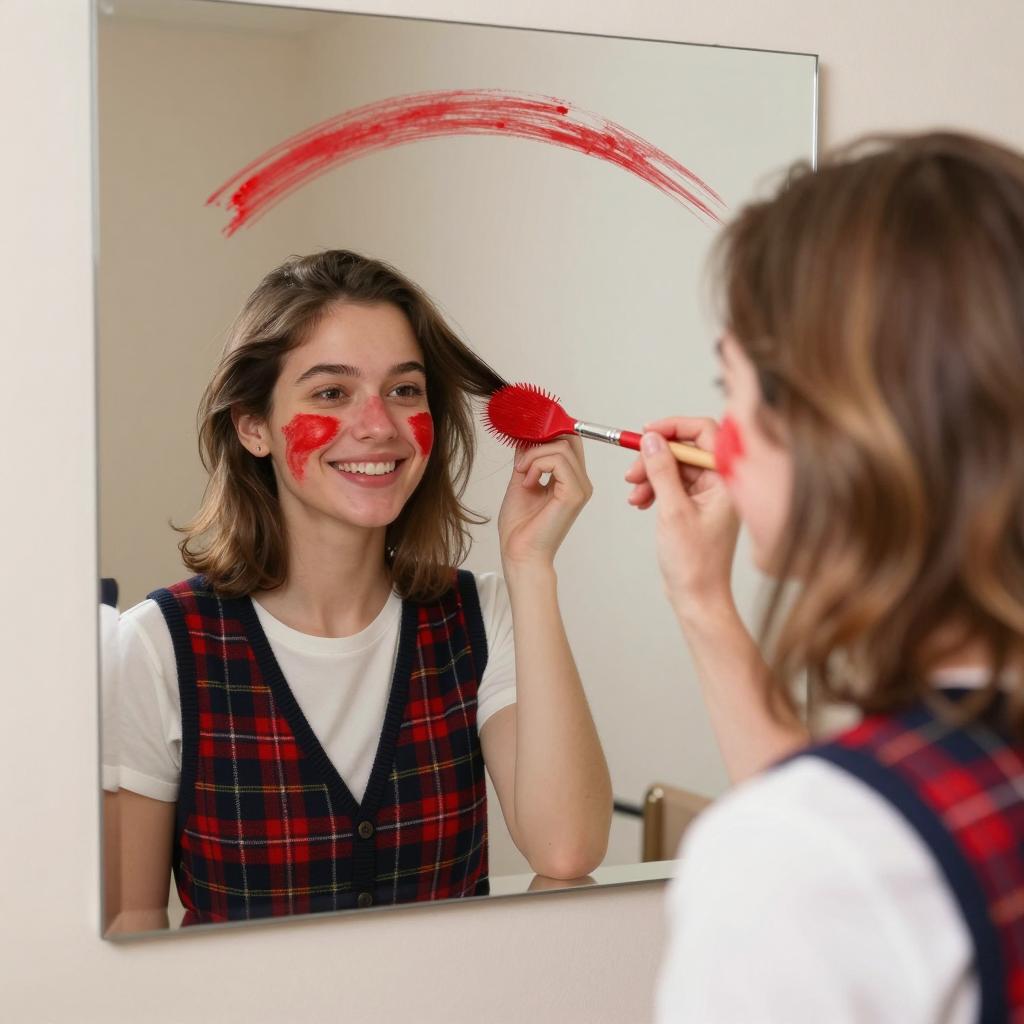 Young woman with red face paint, black hair, and plaid vest smiles at mirror. Older woman with short blonde hair, white shirt holds paintbrush, adding red to mirror reflection. Young woman's hairbrush in hand, reflection shows red streaks. Mirror on beige wall, blurred background. Two people, mirror reflection.