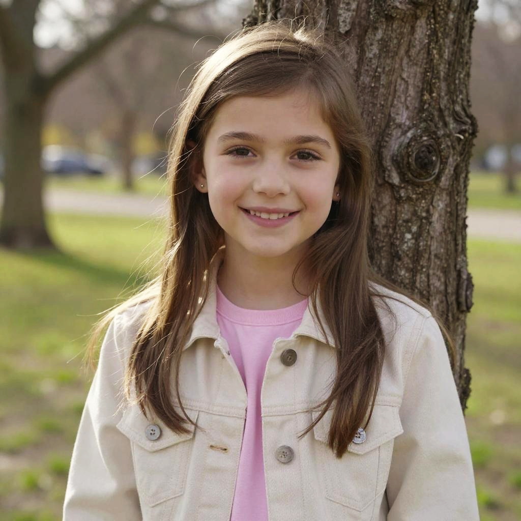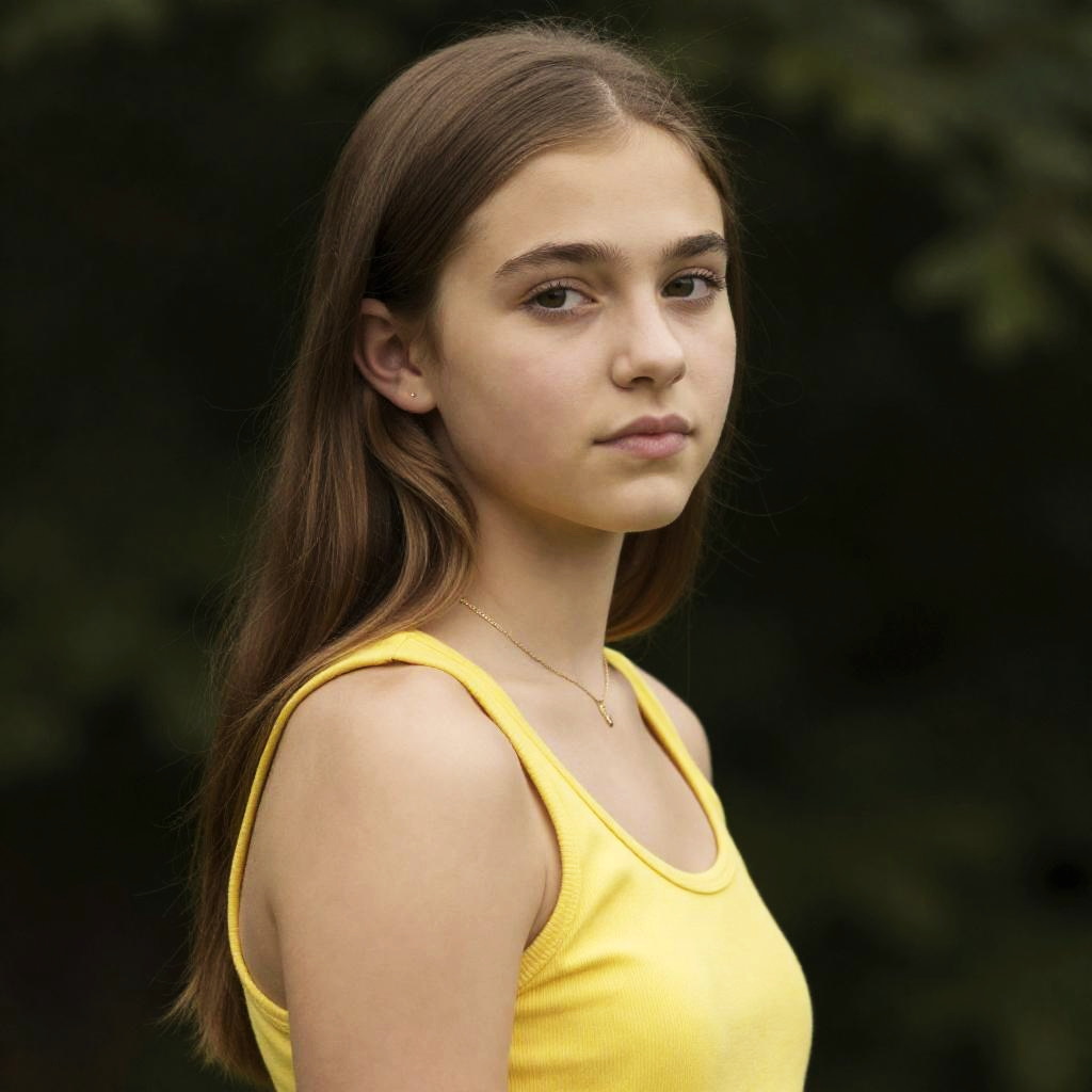 Realistic photo.An image of a teenage girl, with a soft, natural complexion and a long straight hairstyle, featuring a center part. She poses semi-profile, facing slightly to the right, with her gaze meeting the camera. She wears a vibrant yellow tank top and a delicate gold necklace. The lighting is soft and natural, accentuating her thoughtful expression, against a outdoor foliage. realistic photo