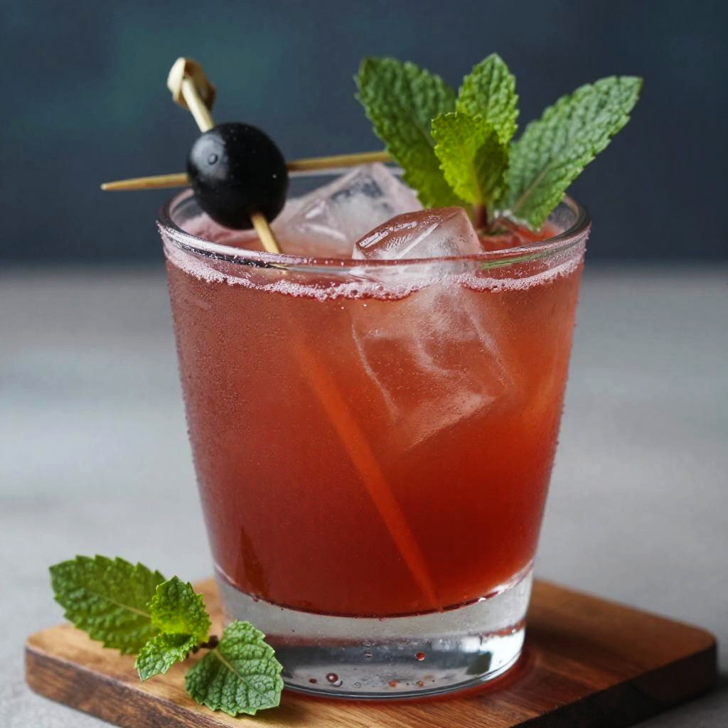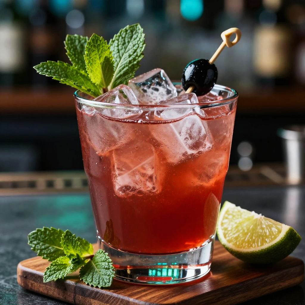 Photograph of a vibrant red cocktail in a clear glass, filled with ice cubes and garnished with a sprig of fresh mint and a black cocktail stirrer. The glass sits on a wooden coaster, with a half lime and another lime slice in the background. The blurred backdrop features colorful, out-of-focus liquor bottles, adding a lively bar atmosphere.