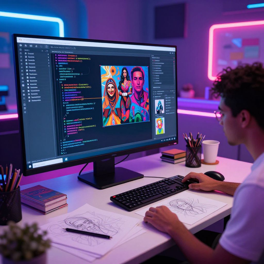 Photograph of a young man with curly dark hair, wearing a white t-shirt, seated at a white desk in a neon-lit room. He is working on a digital drawing tablet in front of a large monitor displaying colorful, vibrant portraits of two women and a man on the screen, alongside code on the left side. The desk has a black keyboard, a white coffee cup, and a pencil holder with colored pencils. Neon pink and blue lights illuminate the background, creating a modern, tech-savvy atmosphere. The room is sleek and minimalistic.