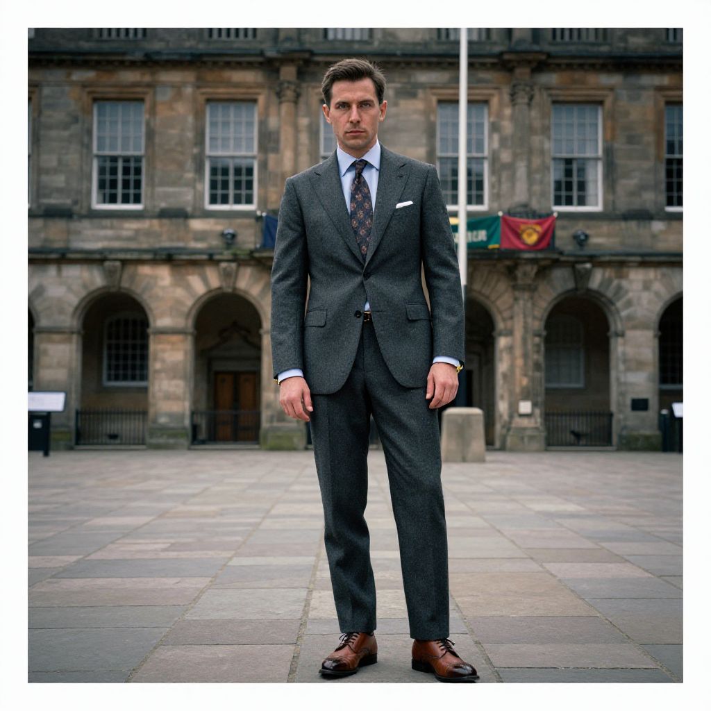 Photograph of a tall, handsome Caucasian man with short brown hair, standing confidently in front of a historic stone building with arched windows and flags. He wears a dark gray, pinstriped three-piece suit with a white shirt and maroon tie, and brown leather dress shoes. His expression is serious, and his hands are by his sides. The stone courtyard has a gray, tiled pavement. The background includes a green and red flag on the right, and the building's aged, textured stone adds a sense of historical significance. The image has a white border.