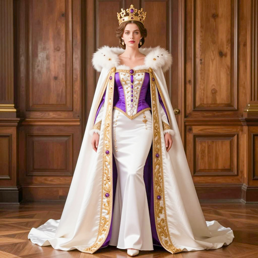 Queen outfit costume, photorealistic, queen outfit, standing pose, full-body, female model, brown hair, crown, ornate golden crown, white and purple corset, white and gold cape, white flowing pants, gold and purple detailing, white fur collar, standing on wooden floor, dark wooden paneled wall in background, elegant, regal, royal attire, fantasy style, T2I, realistic ures, soft lighting, detailed costume, classical royal dress, formal, historical-inspired fashion, rich colors, elaborate design