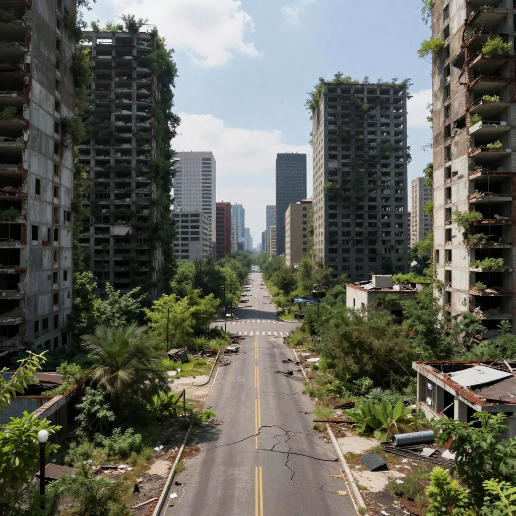 Vast city in a post-apocalyptic setting, abandoned skyscrapers overtaken by greenery, cracked roads with nature reclaiming space, quiet yet imposing urban ruins under a bright sky, remnants of technology fading into the wilderness, a hauntingly beautiful fusion of decay and life