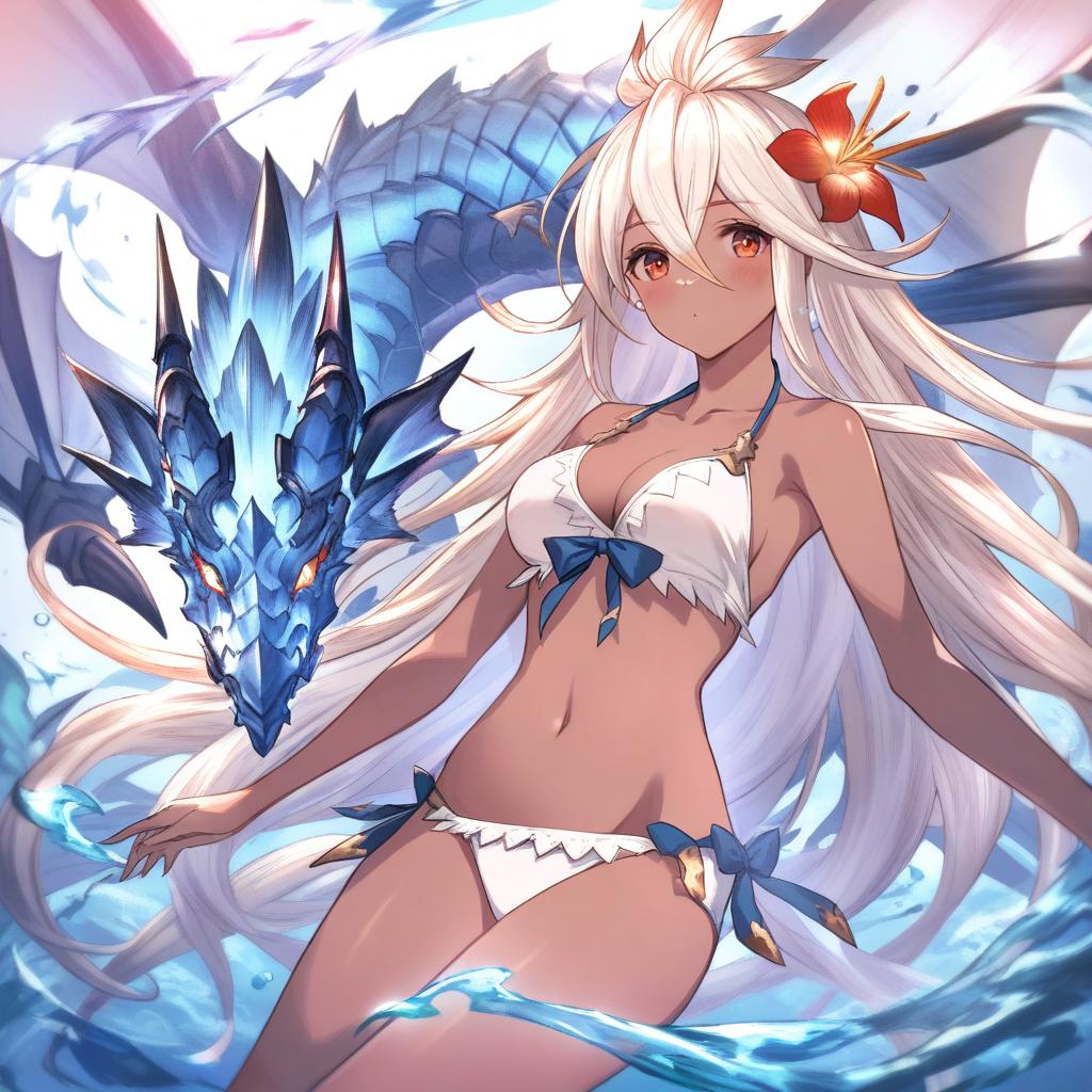 Zooey (granblue fantasy), granblue fantasy, 1girl, dark-skinned female, red eyes, hair between eyes, white hair, very long hair, long hair, ahoge, hair flower, medium breasts, cleavage, navel, collarbone, white bikini, bare shoulders, dragon, by artist chameleon (ryokucha combo), animagine